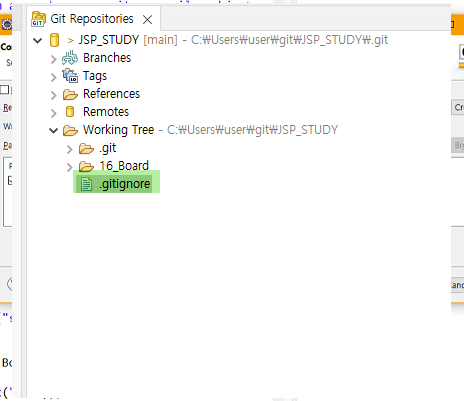 나오는 코드를 복사 => 이클립스의 repository/working tree/.gitignore에 붙여넣은 뒤 저장