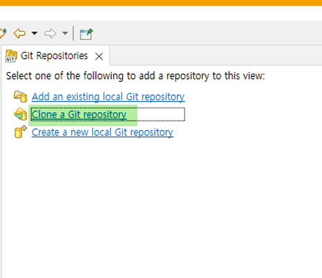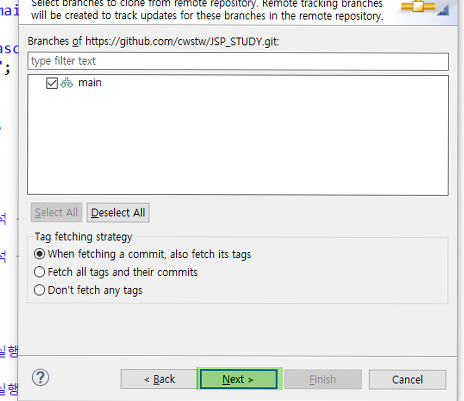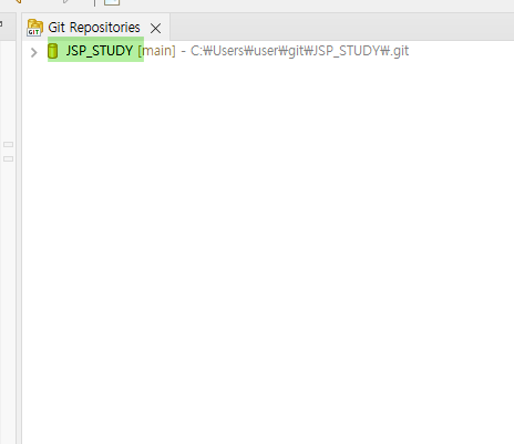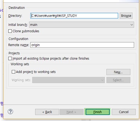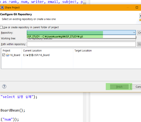 => repository 클릭해서 아까 만든 경로 선택 => finish => 연동완료!